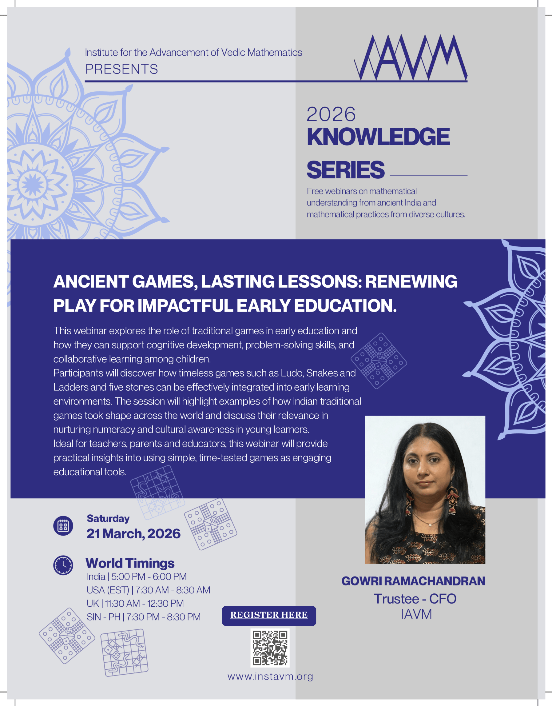 This webinar explores the role of traditional games in early education and how they can support cognitive development, problem-solving skills, and collaborative learning among children. Participants will discover how timeless games such as Ludo, Snakes and Ladders and five stones can be effectively integrated into early learning environments. The session will highlight examples of how Indian traditional games took shape across the world and discuss their relevance in nurturing numeracy and cultural awareness in young learners. Ideal for teachers, parents and educators, this webinar will provide practical insights into using simple, time-tested games as engaging educational tools.
